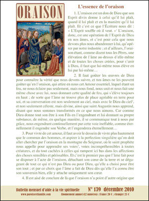 LE BULLETIN ORAISONAu service de la vie spirituelle du chrétien...Chaque mois, ORAISON vient nourrir la lecture priante de la tradition spirituelle chrétienne. ORAISON comporte quatre pages : les deux premières pages présentent et commentent un texte majeur de cette Tradition. Les pages suivantes développent un thème important de vie spirituelle, en laissant le plus possible parler les auteurs que l'Église nous donne pour maîtres. ORAISON peut être reçu par courriel ou par voie postale. La réception du bulletin par courriel est gratuite. La réception par voie postale suppose la souscription sur notre espace librairie d’un abonnement au prix de 35 €/an pour la France et de 40 €/an pour l'Étranger. L’abonnement donne droit à la réception du bulletin imprimé en quadrichromie sur un papier de qualité, et à la réception de l’Avent et du Carême à l’école des saints. Les abonnés au bulletin sont également tenus au courant de la vie de l'Association et du programme des formations qu'elle propose.